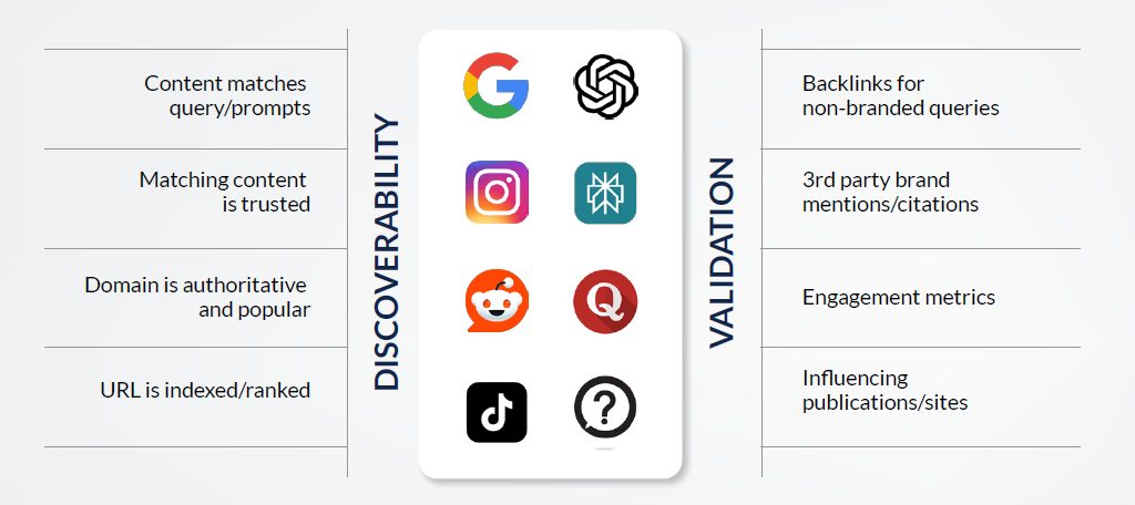 Discovery ensures your content matches relevant queries, builds quality backlinks for non-branded searches, and maintains proper indexing. It’s about making your content findable and citable by AI systems.