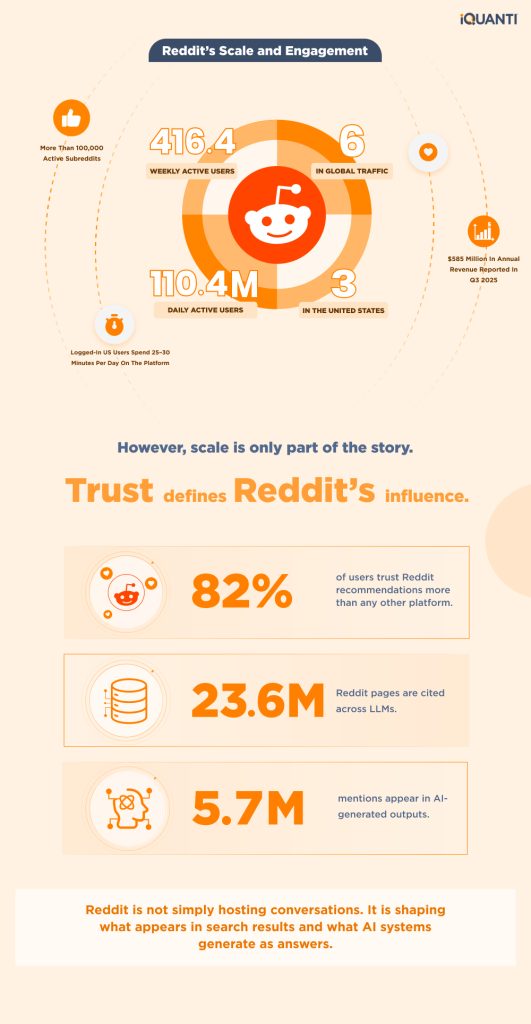 Reddit is one of the most influential UGC platforms globally. Logged-in users in the US spend between 25 and 30 minutes per day on the platform. This is no longer just a community platform. It is a structural component of digital discovery.