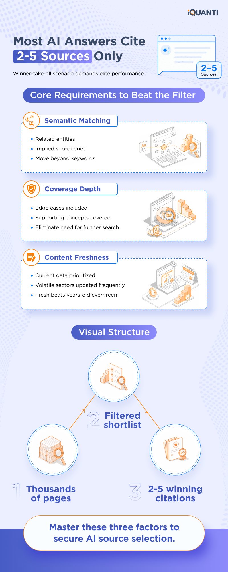 Earlier, there were ten blue links where even positions three or four can garner significant traffic. In AI search, the filtering process is far more brutal. While an LLM may index thousands of pages during the retrieval phase, the synthesis phase typically filters these down to a shortlist of candidates.